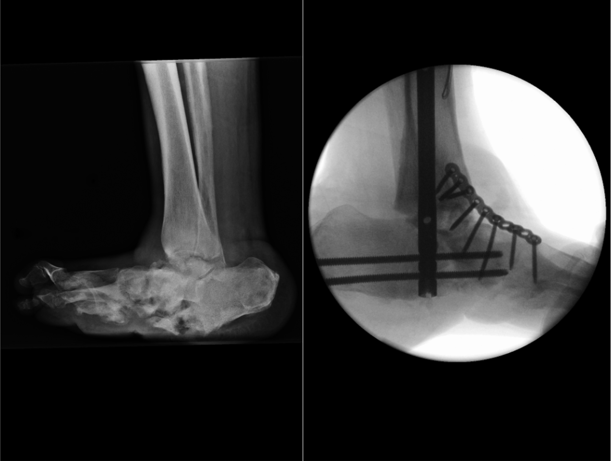 Injury to the diabetic neuropathic foot can trigger inflammation and aggressive osteolysis resulting in multiple fractures and bone fragmentations. Ongoing research has focused on understanding the pathogenic mechanisms driving such activity, such as the osteoclastogenic cytokine receptor activator of nuclear factor-κβ ligand RANKL, and on exploring the role of proinflammatory cytokines such as tumour necrosis factor-α. This raises the potential of future putative pharmacologic therapeutic options, something we lack currently. Contemporary orthopaedic reconstruction techniques offer a new hope to those with gross deformities and facing amputation (Figure 4).