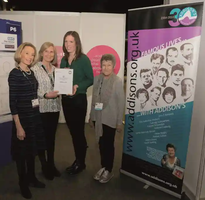 Helen receiving the Annette Louise Seal Memorial Award from the Addison’s Disease Self-Help Group at SfE BES 2019, alongside (far left) Dr Helen Turner (Consultant Endocrinologist, Oxford Centre for Diabetes, Endocrinology and Metabolism). ©H Loo