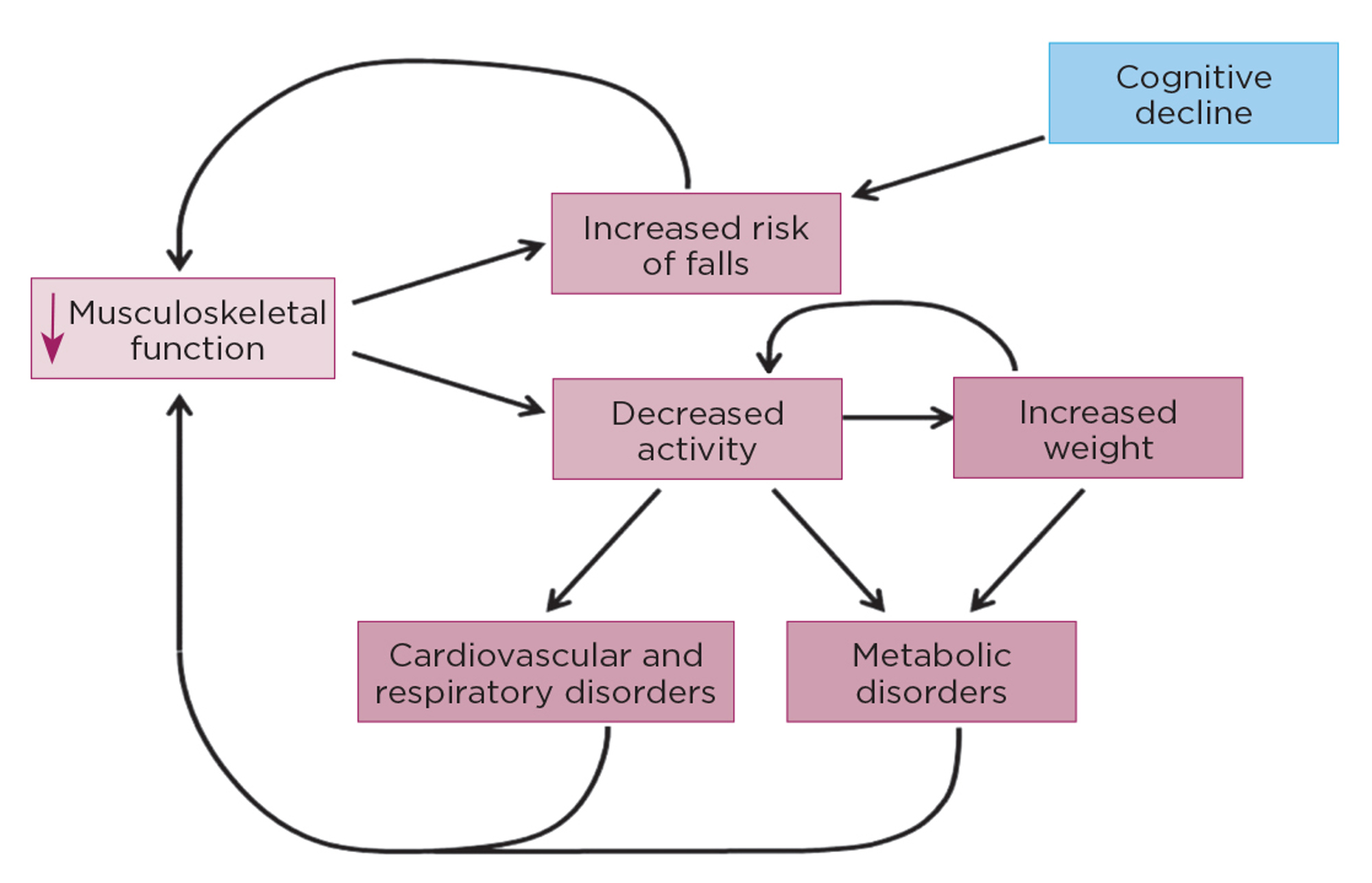 Figure 2. Placing musculoskeletal decline at the centre of age-related health decline. The decrease in musculoskeletal function can lead to increasing falls and decreasing activity, which feedback directly and indirectly, causing further declines. These effects are known to influence other age-related conditions and co-morbidities.