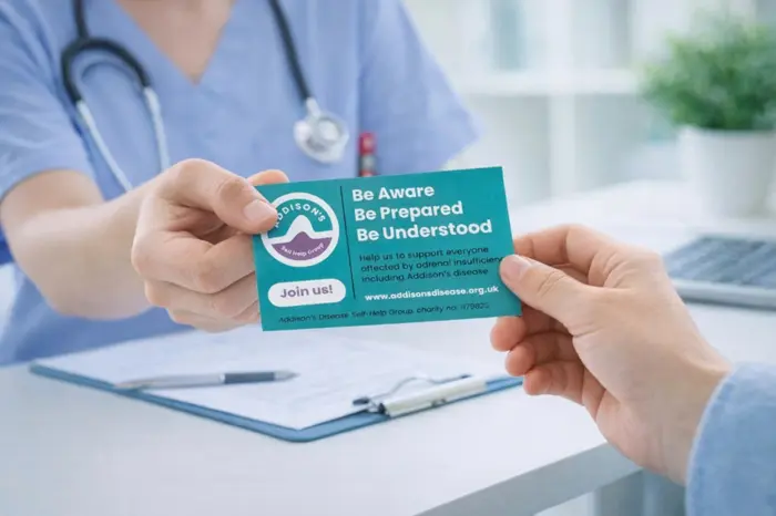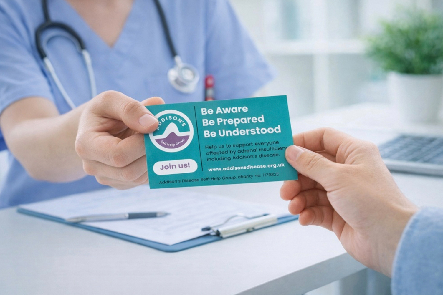 The Addison’s Disease Self-Help Group (ADSHG) is offering free pocket-sized cards to help you signpost patients to trusted support. The cards can be included with clinical letters, added to emergency injection kits, or handed out during appointments. They support a shared aim to help steroid-dependent patients be aware, be prepared and be understood.